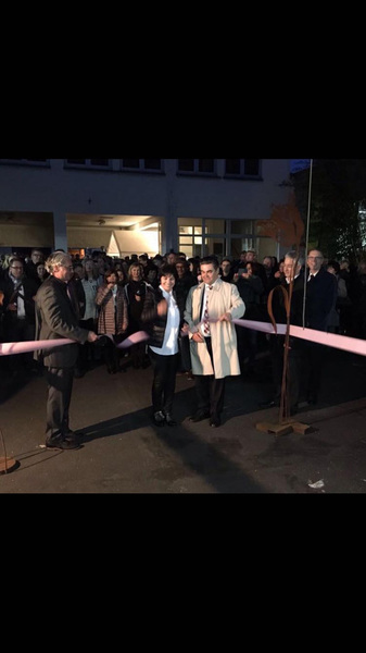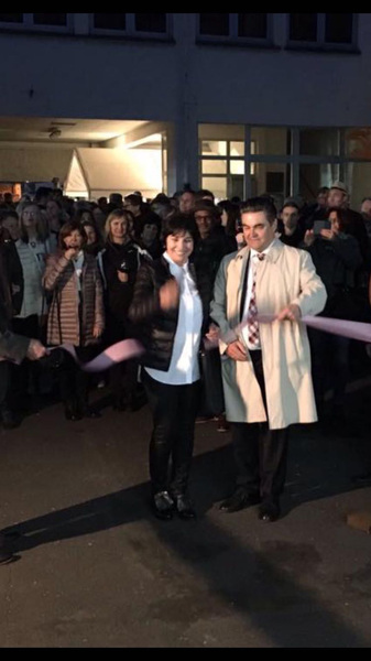 Oberbürgermeister KLAUS HERZOG und Künstlerin MARIANA MIREA von blackcoffeeart schneiden das rosa Band durch zur Eröffnung der Kunstausstellung MenschWerk in Aschaffenburg gestern Abend.
